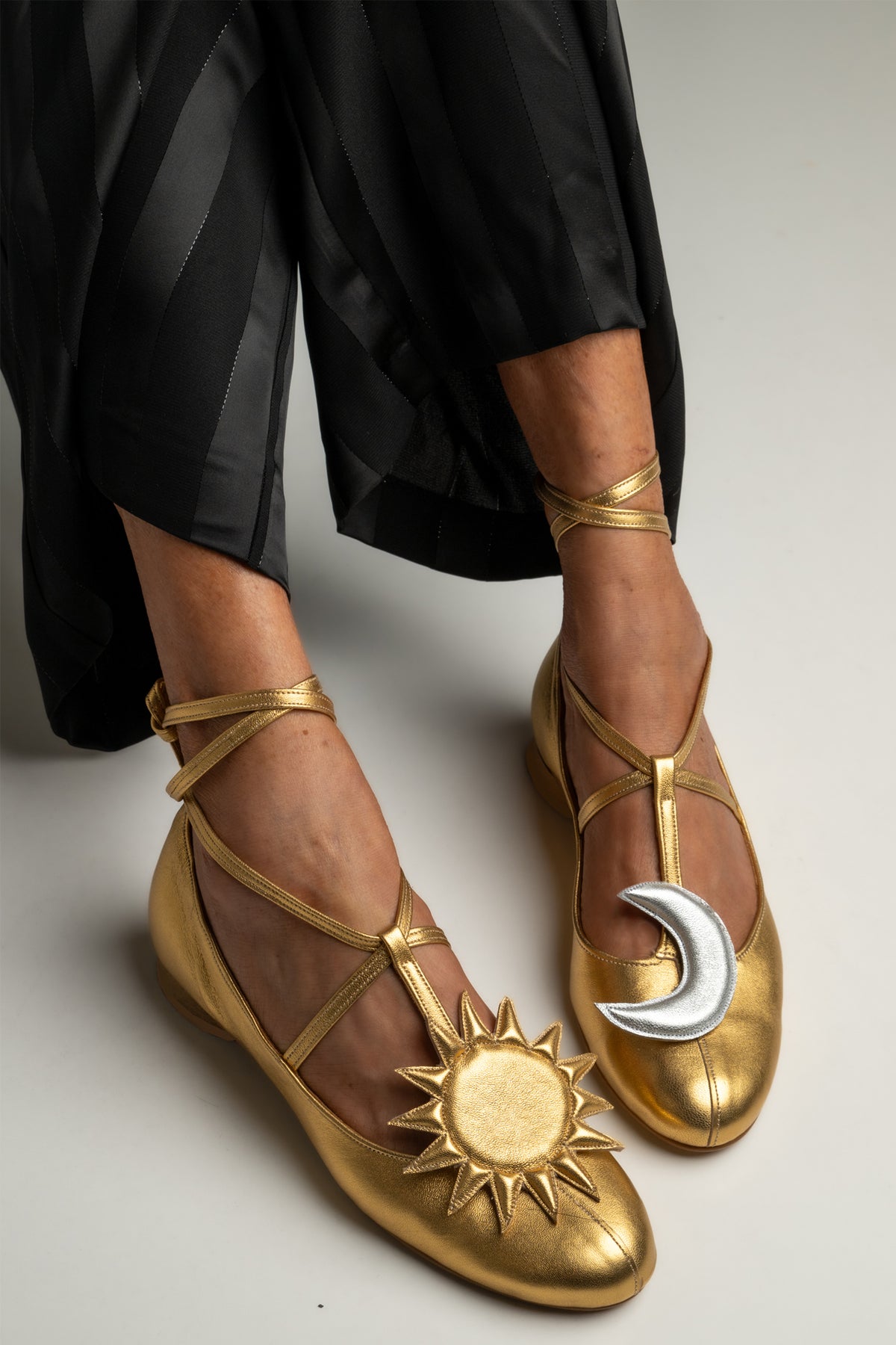In a world that feels a little heavier, a little dimmer, we still choose light. The Poet was born from that quiet belief, that wonder has not left us, that beauty still lives in the simplest things, and that magic, like the sun and the moon, is eternal.These ballerinas are a small verse for everyday life. A line of poetry written in gold. A reminder that joy can be worn. That courage can be gentle. That even in uncertain times, we can walk with light beneath our feet. Crafted from soft metallic leather sourced in Greece, The Poet carries the glow of the sun and the mystery of the moon in its luminous sheen and celestial details. Each pair is handcrafted by skilled Greek artisans, honoring a tradition of care, patience, and human touch. The design is grounded by a circular wooden heel, also handcarved in Athens, a symbol of wholeness, cycles, and the timeless rhythm we all share. Inside, a soft, comfortable footbed holds you with ease, because beauty should feel as good as it looks.