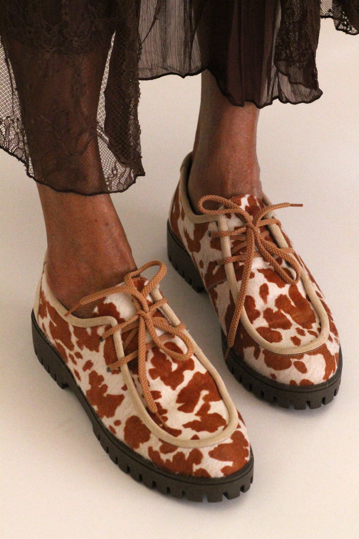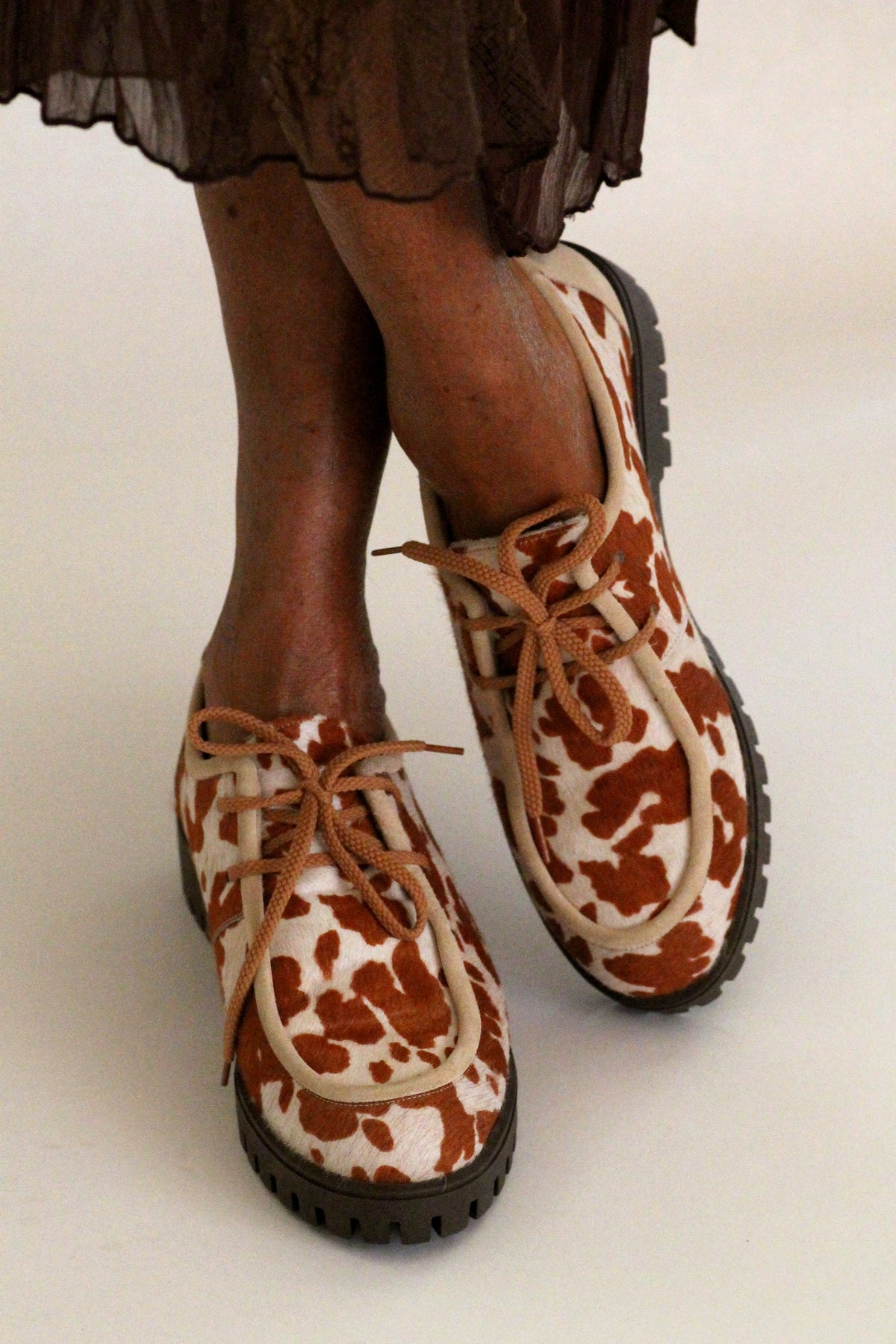 Crafted from premium cowhide leather in a warm, caramel toned cow print, Milkyway brings a soft, earthy glow to winter dressing. Its palette leans into gentle neutrals, with beige suede details that give the shoe a creamy, sunlit vibe,like golden hour made wearable. Inside, the plush faux fur lining wraps your feet in warmth, turning every step into a cozy little luxury. A handcrafted beaded charm, made in our Athens workshop, adds an artisanal touch that feels both subtle and special pearl-like accents and textured beads that play beautifully against the natural pattern.
