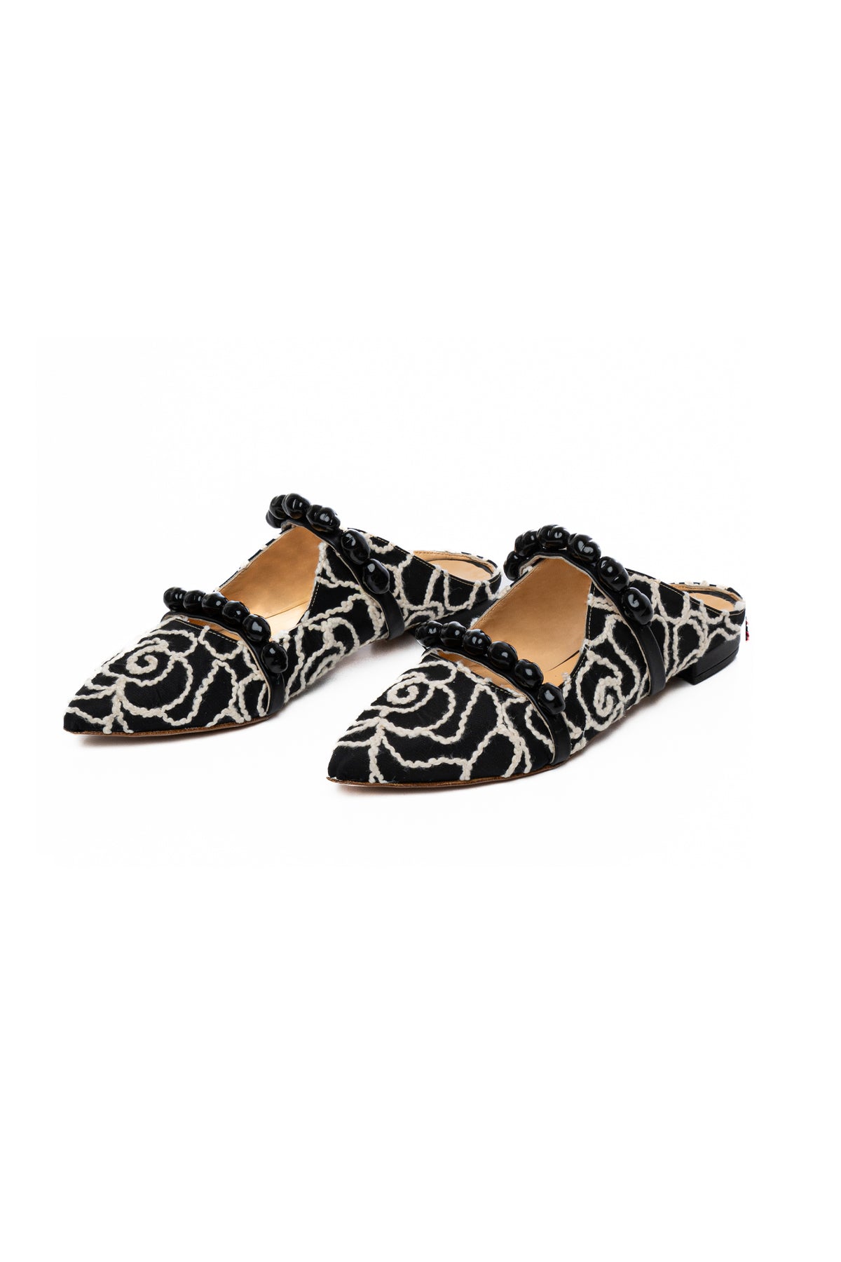 The Onyx mules are a study in timeless sophistication. Defined by a bold black andwhite floral motif, they are adorned with lustrous jet black beads that add sculptural allure to each step. Designed to elongate the feet with their sleek silhouette, these shoes will be an impeccable choice for the discerning wardrobe.