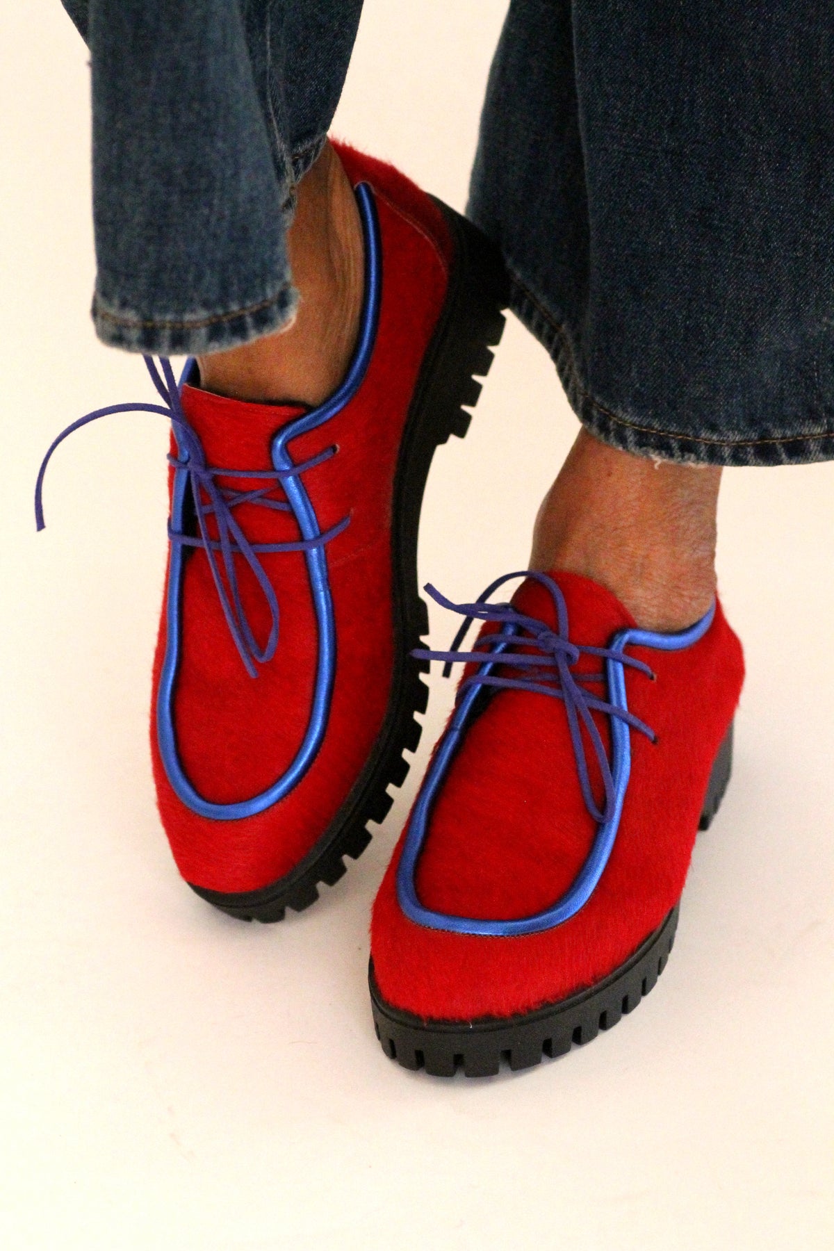 Palomina is made for the woman who isn’t afraid of standing out, not in a loud way, but in a confident, intentional, I-know-what-I-like way. She loves pieces that feel unique, that bring joy, that turn getting dressed into a small celebration of her own style. Crafted from deep wine red cowhide leather and contrasted with electric blue details, Palomina is striking without trying too hard. The leather cords are hand embellished with removable macramés and crystals by our team, adding a touch of handcrafted charm to the bold palette. Inside, they’re lined with black faux fur for soft warmth, while the durable sole keeps every step comfortable.