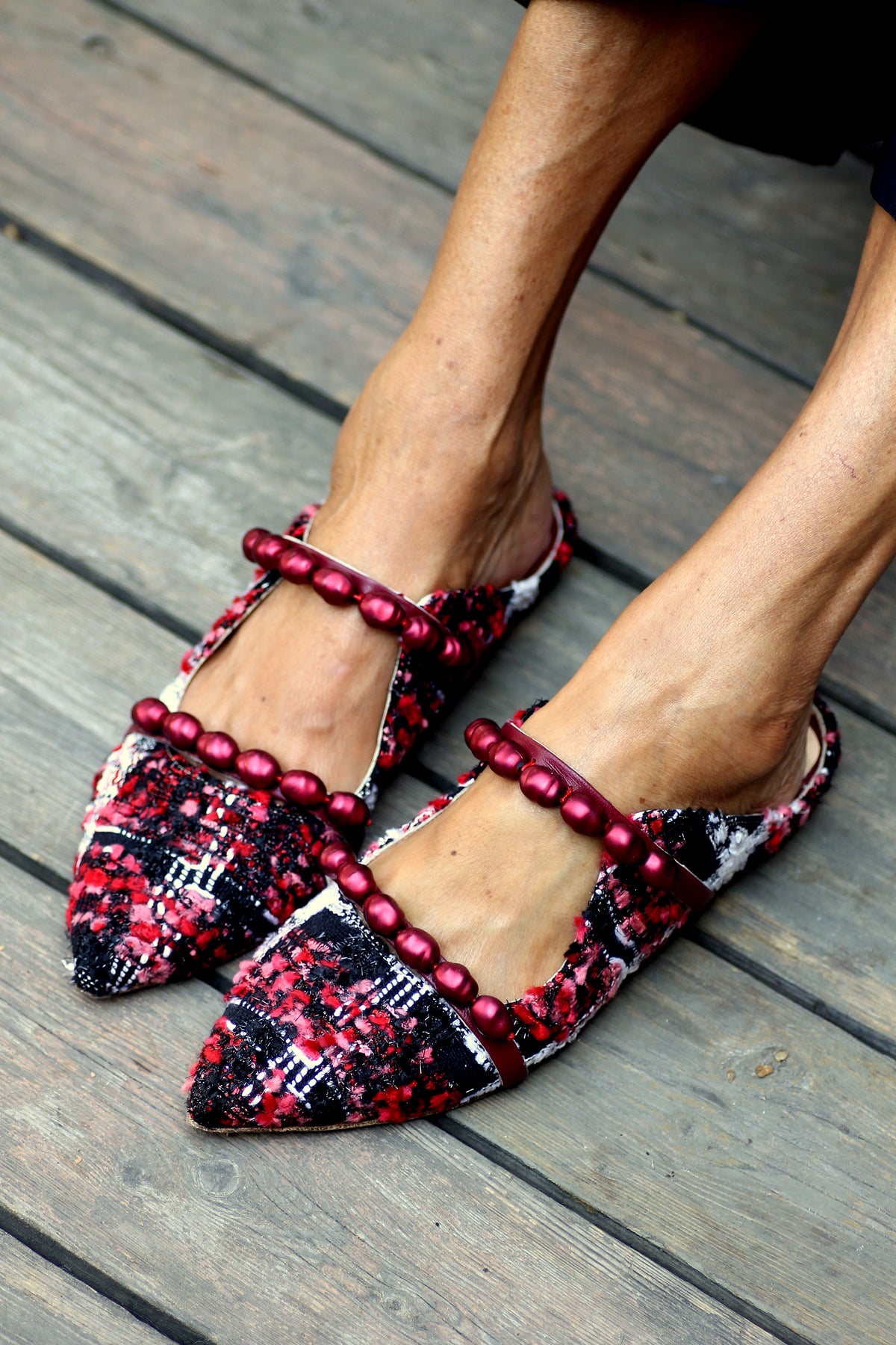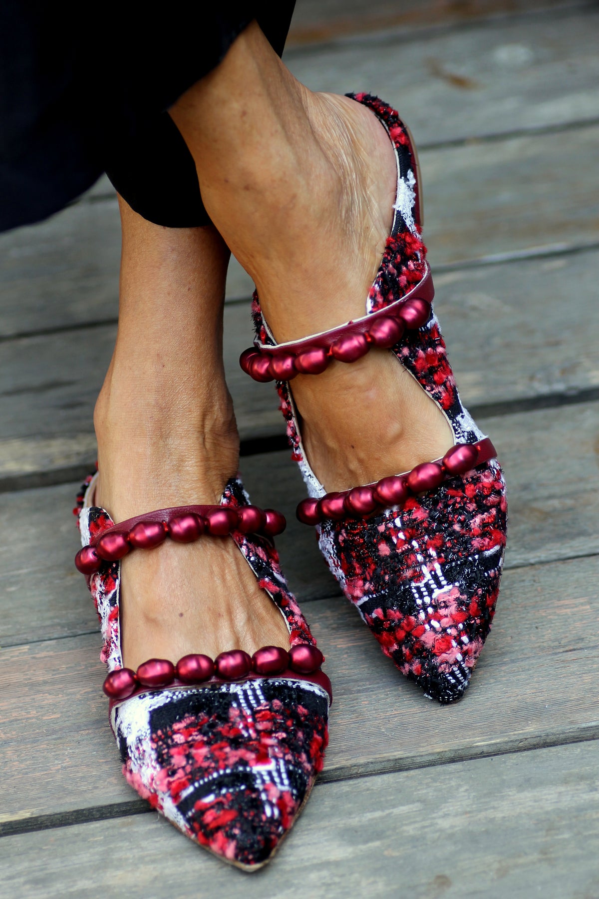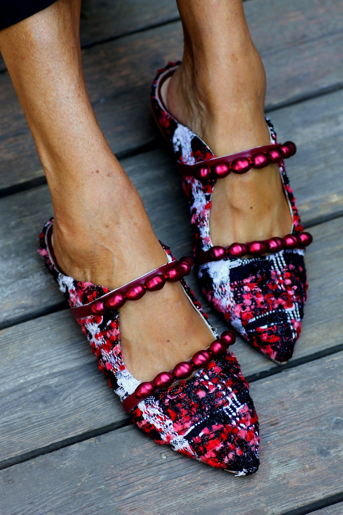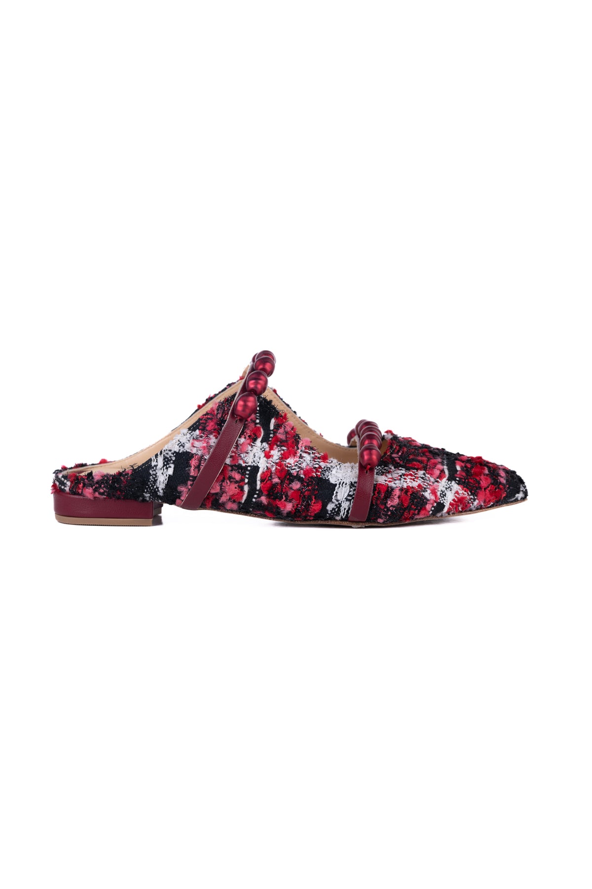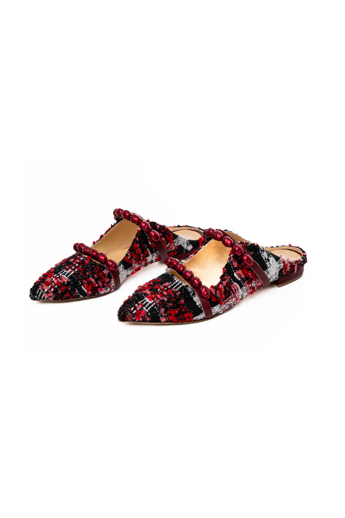 Handcrafted in richly textured tweed and qdorned with lustrous wine red pearls that trace each strap with sculptural precision, the Rubi transforms every step into a statement, making them the quintessential piece for a sophisticated autumn wardrobe.