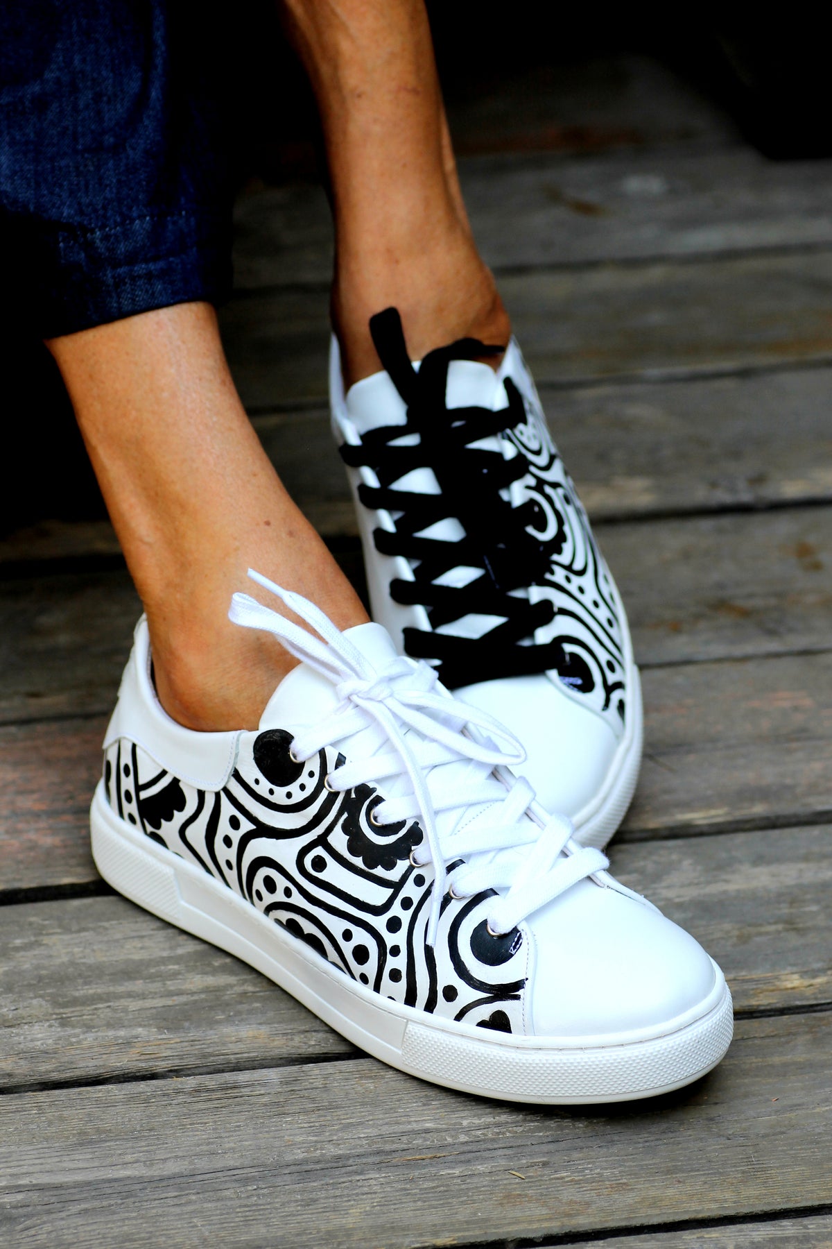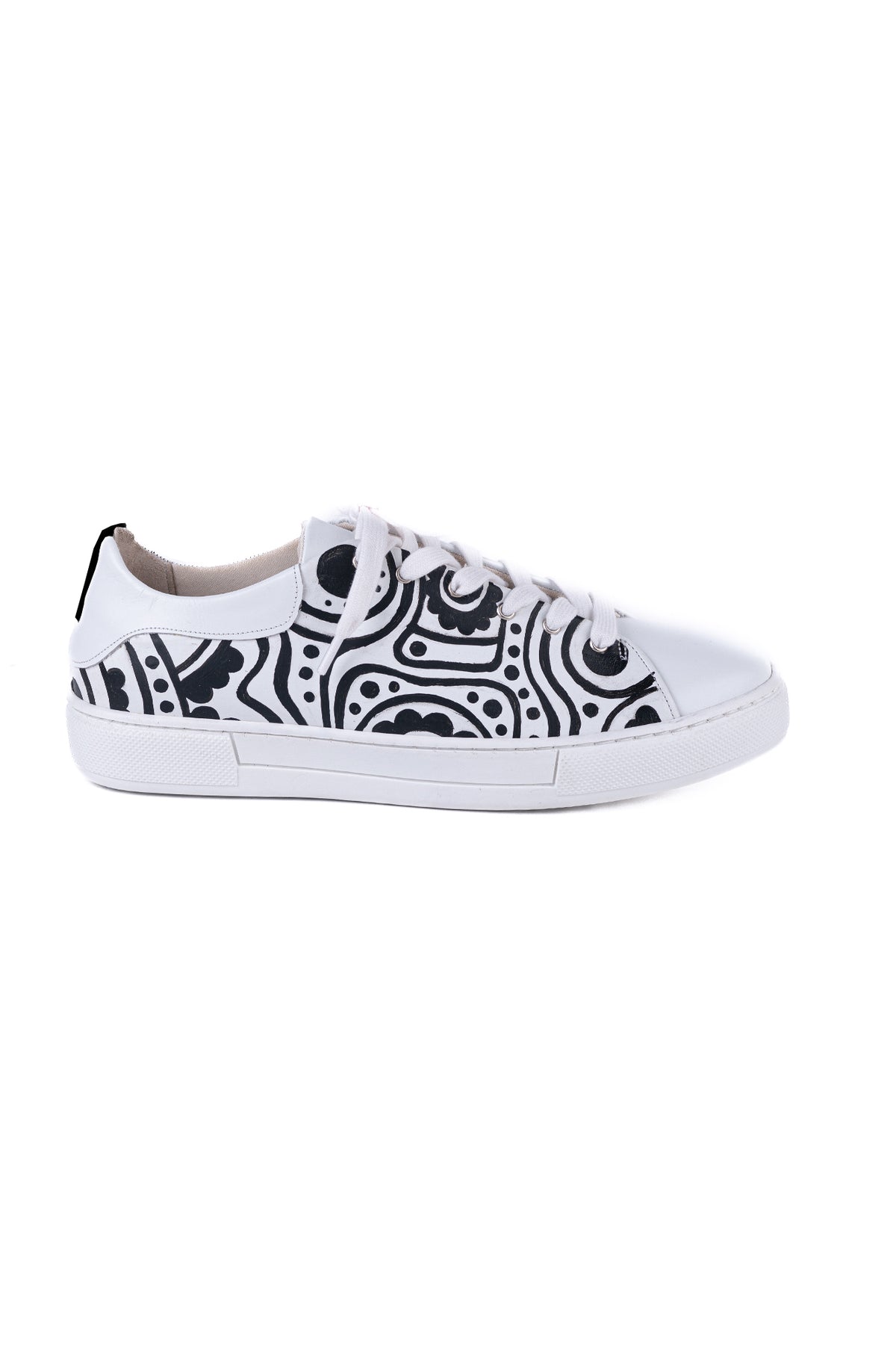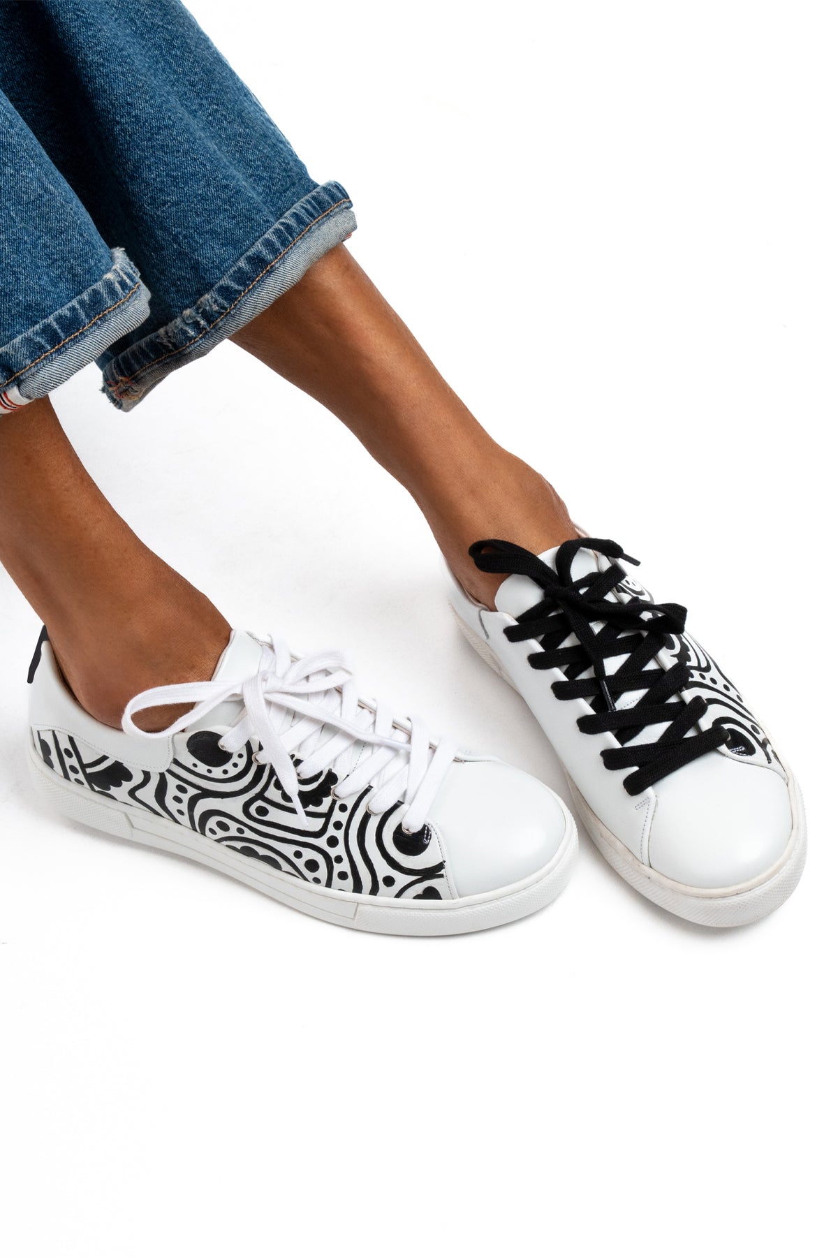 Named after the Japanese word for black, Kuro is a study in contrast and precision. It is made from soft buttery leather and hand painted with monochrome swirls and motifs, both graphic and fluid. Each pair is individually finished, balancing boldness with restraint.
