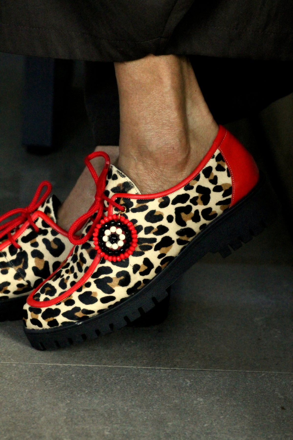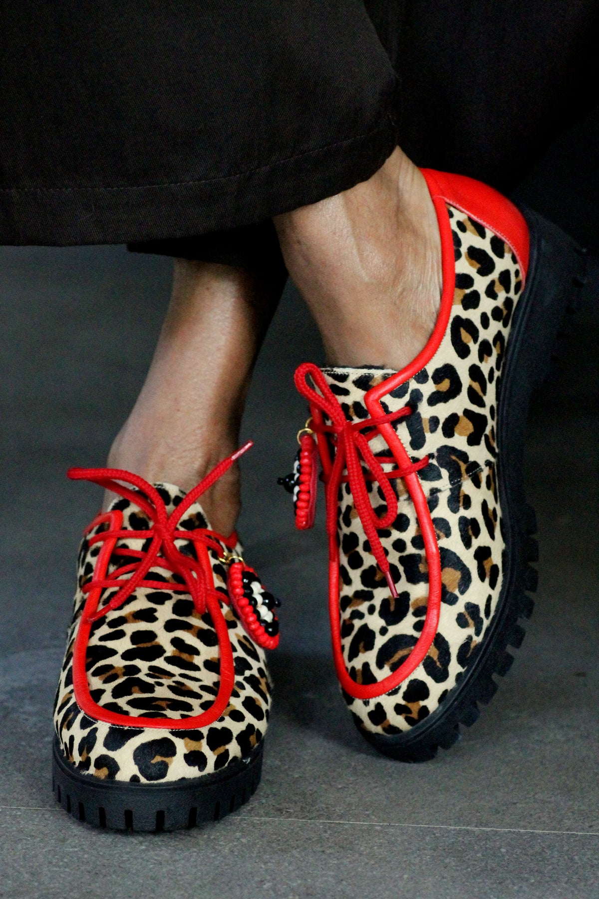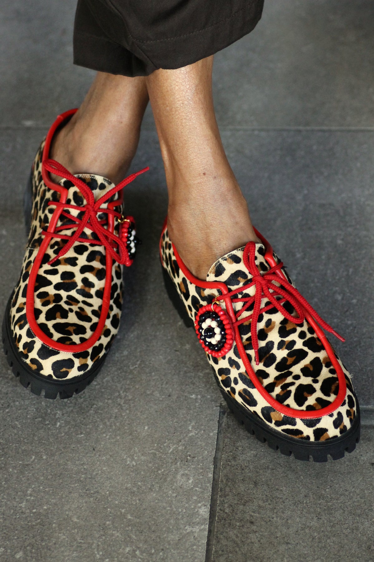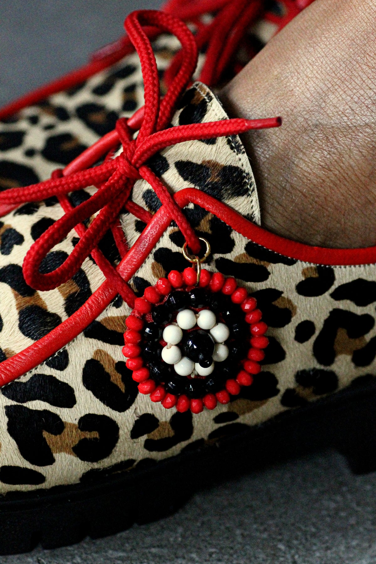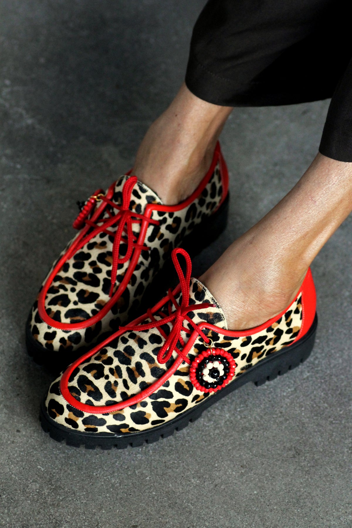 Say hello to Fiera, named after the Italian word for "fierce". Fiera is made for the days when your confidence is louder, your energy is bolder, and blending in is simply not on the agenda. The upper is crafted from premium cowhide leather in a striking leopard print, trimmed with vibrant red leather details that instantly elevate the silhouette. Inside, each pair is softly lined with faux fur for warmth and ease, while the outside features a handmade motif, beaded and assembled one by one in our Athens workshop.