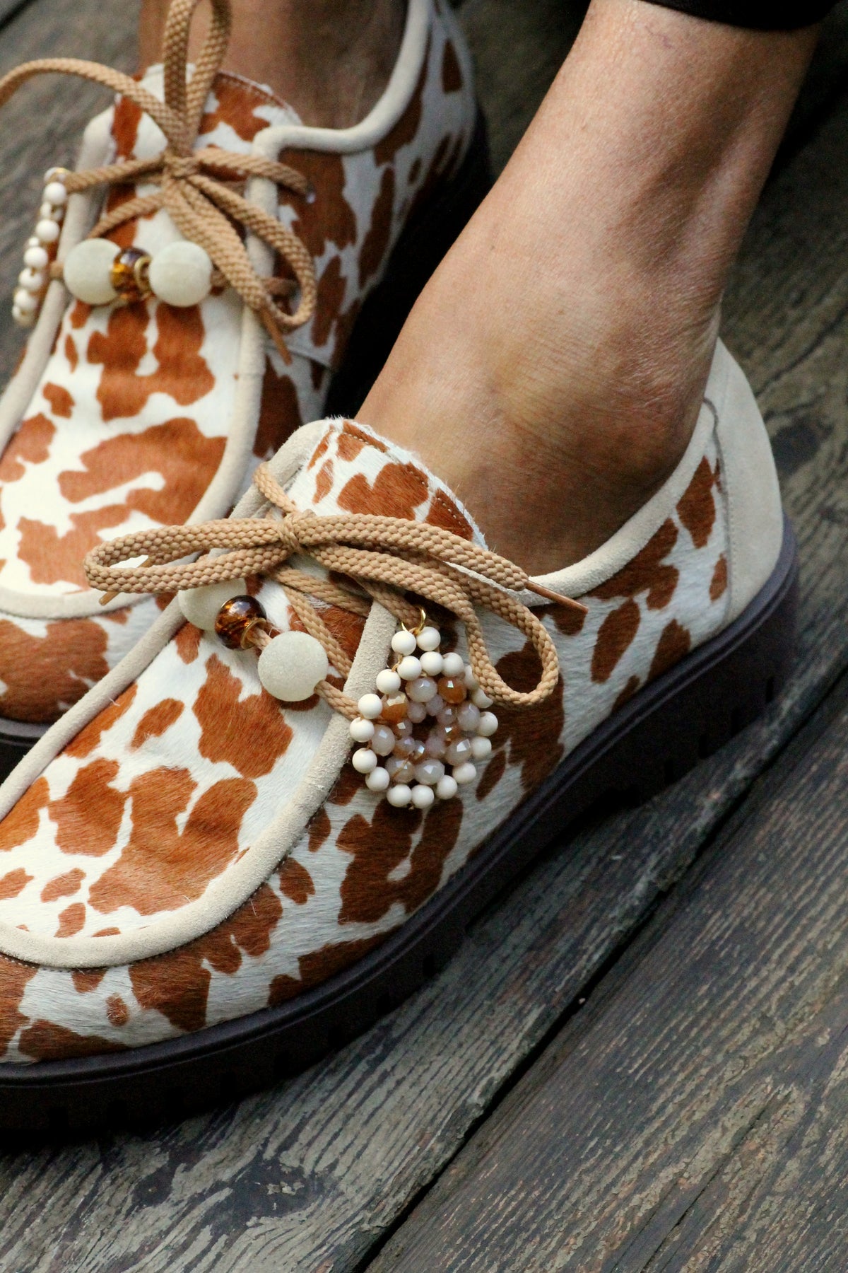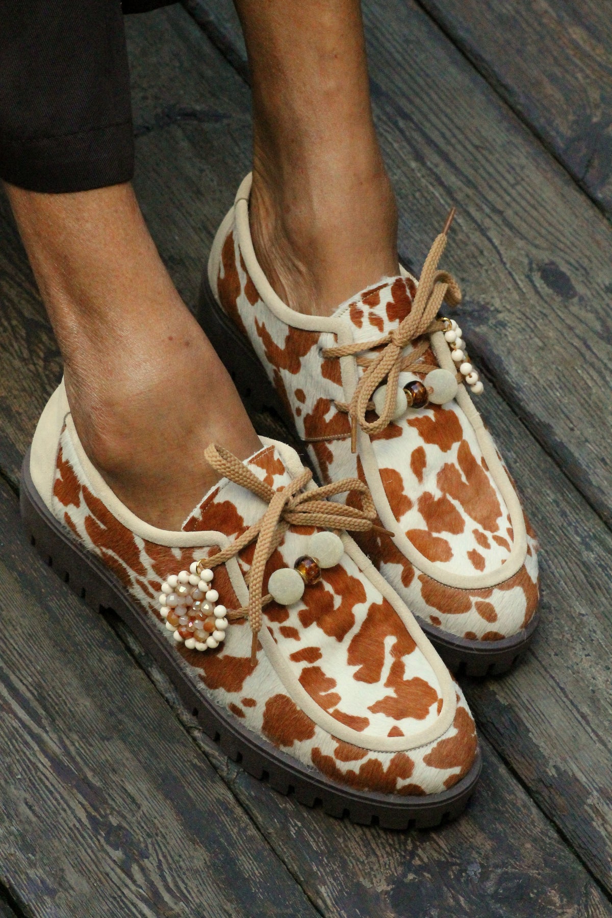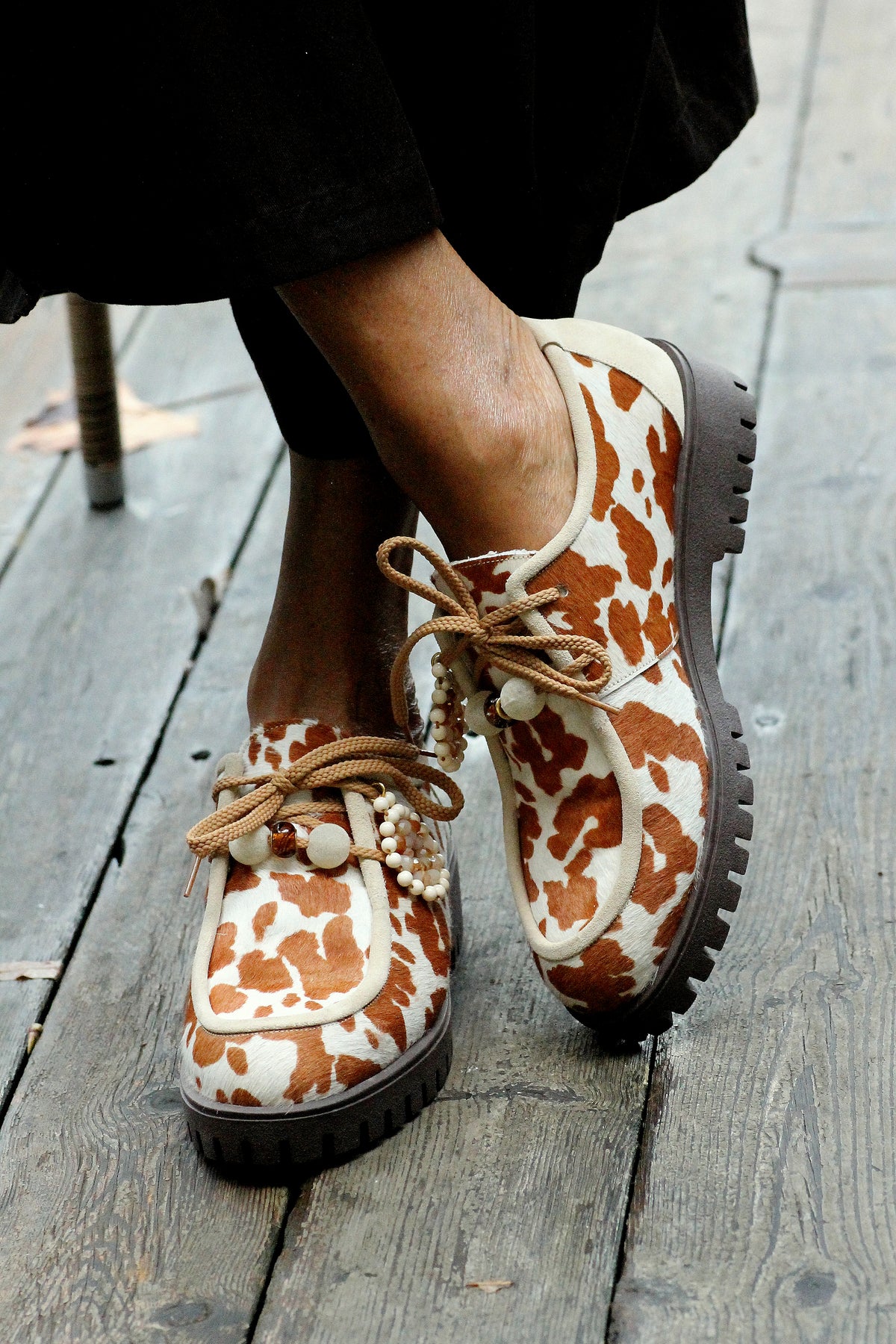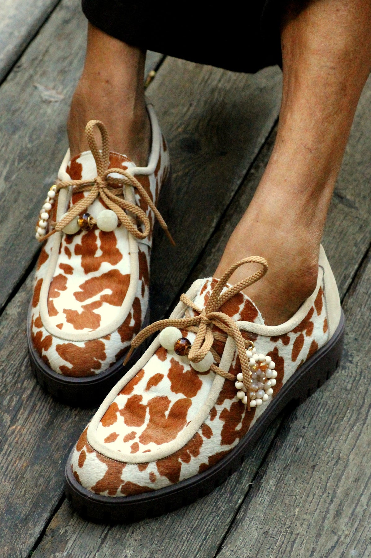 Crafted from premium cowhide leather in a warm, caramel toned cow print, Milkyway brings a soft, earthy glow to winter dressing. Its palette leans into gentle neutrals, with beige suede details that give the shoe a creamy, sunlit vibe,like golden hour made wearable. Inside, the plush faux fur lining wraps your feet in warmth, turning every step into a cozy little luxury. A handcrafted beaded charm, made in our Athens workshop, adds an artisanal touch that feels both subtle and special pearl-like accents and textured beads that play beautifully against the natural pattern.