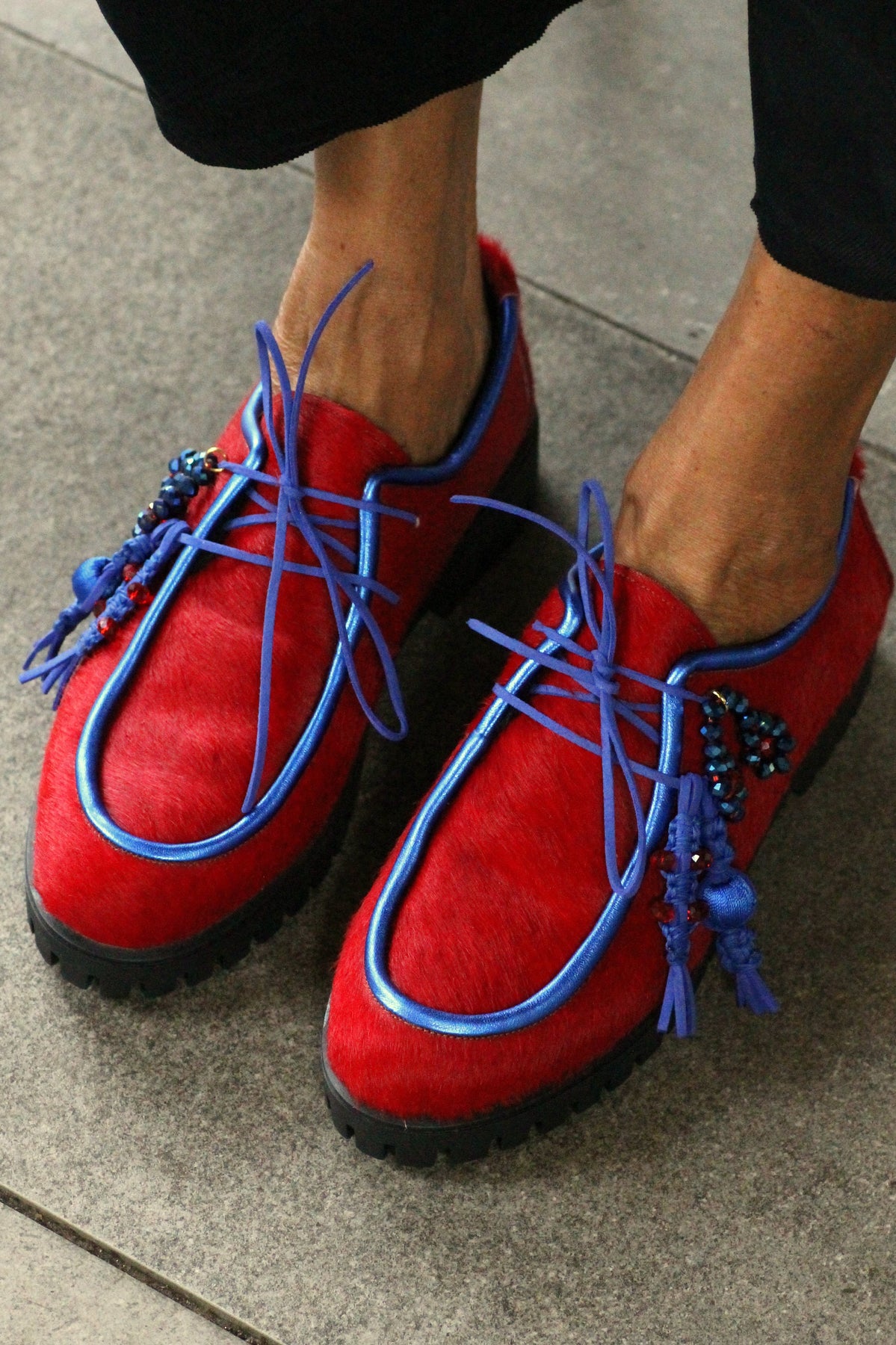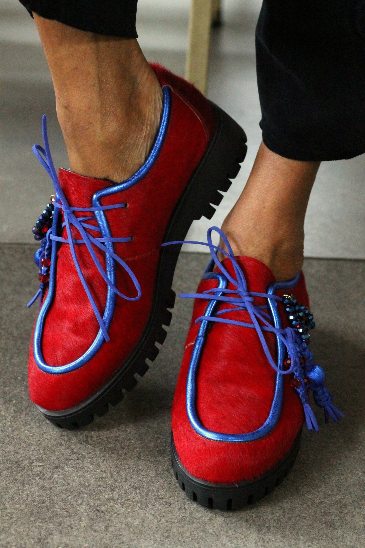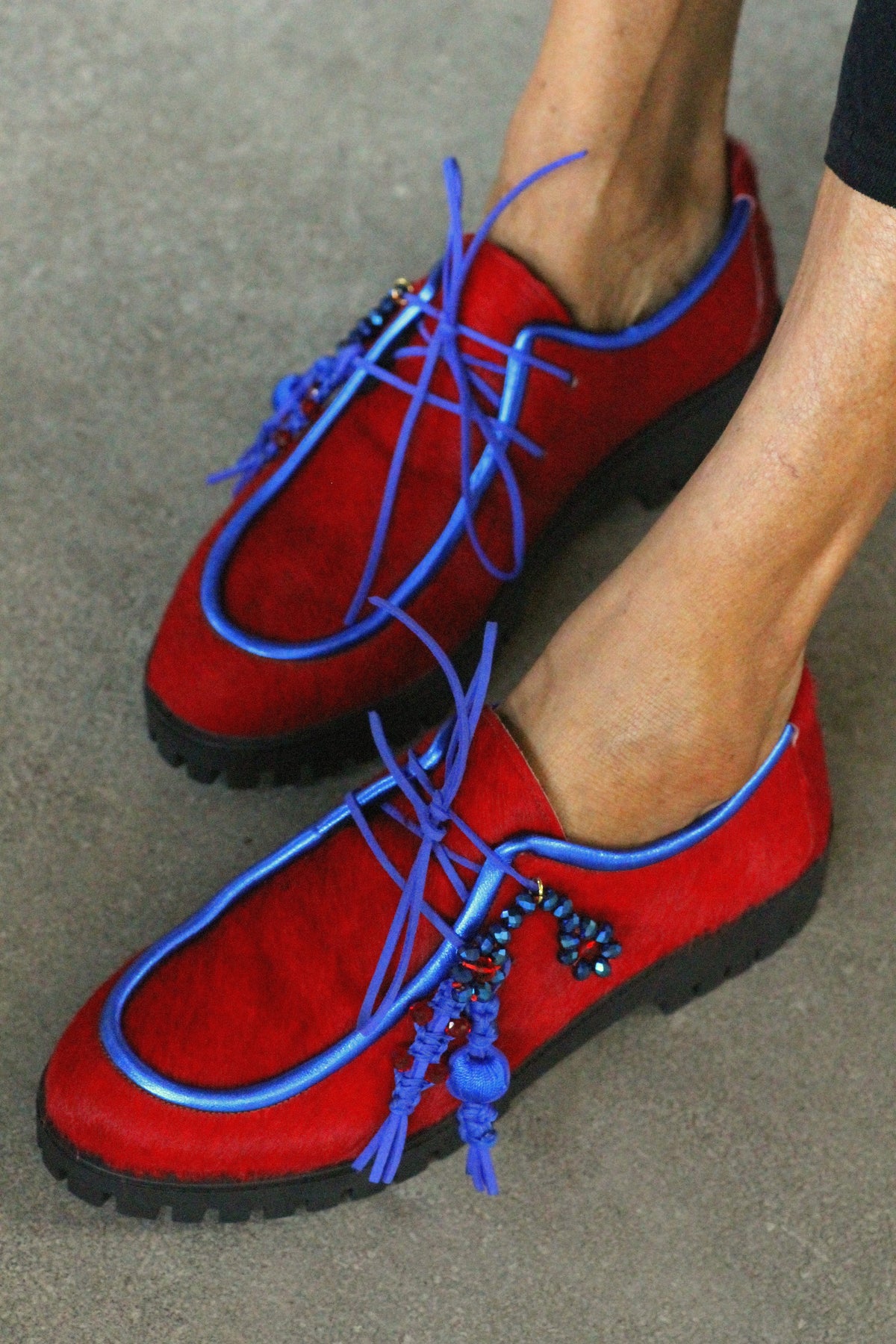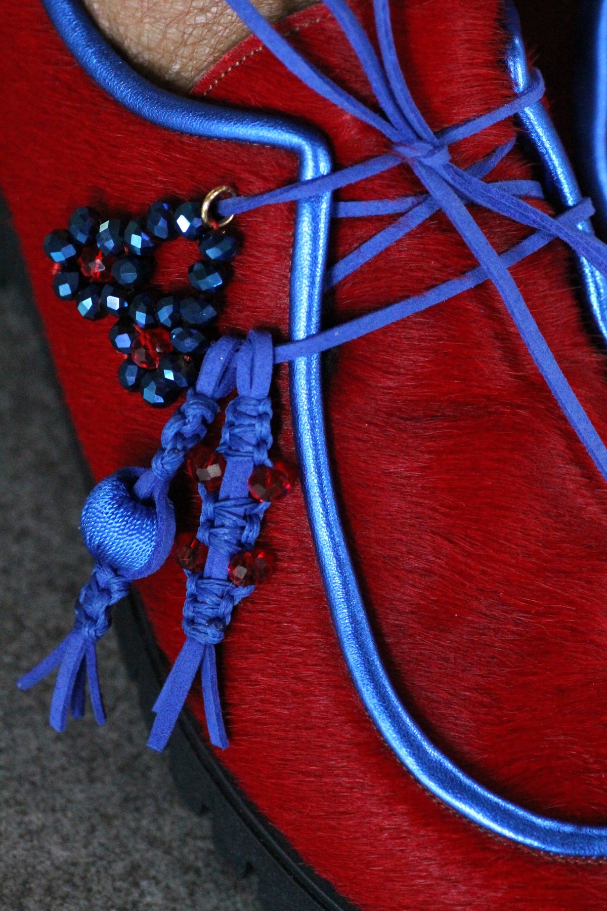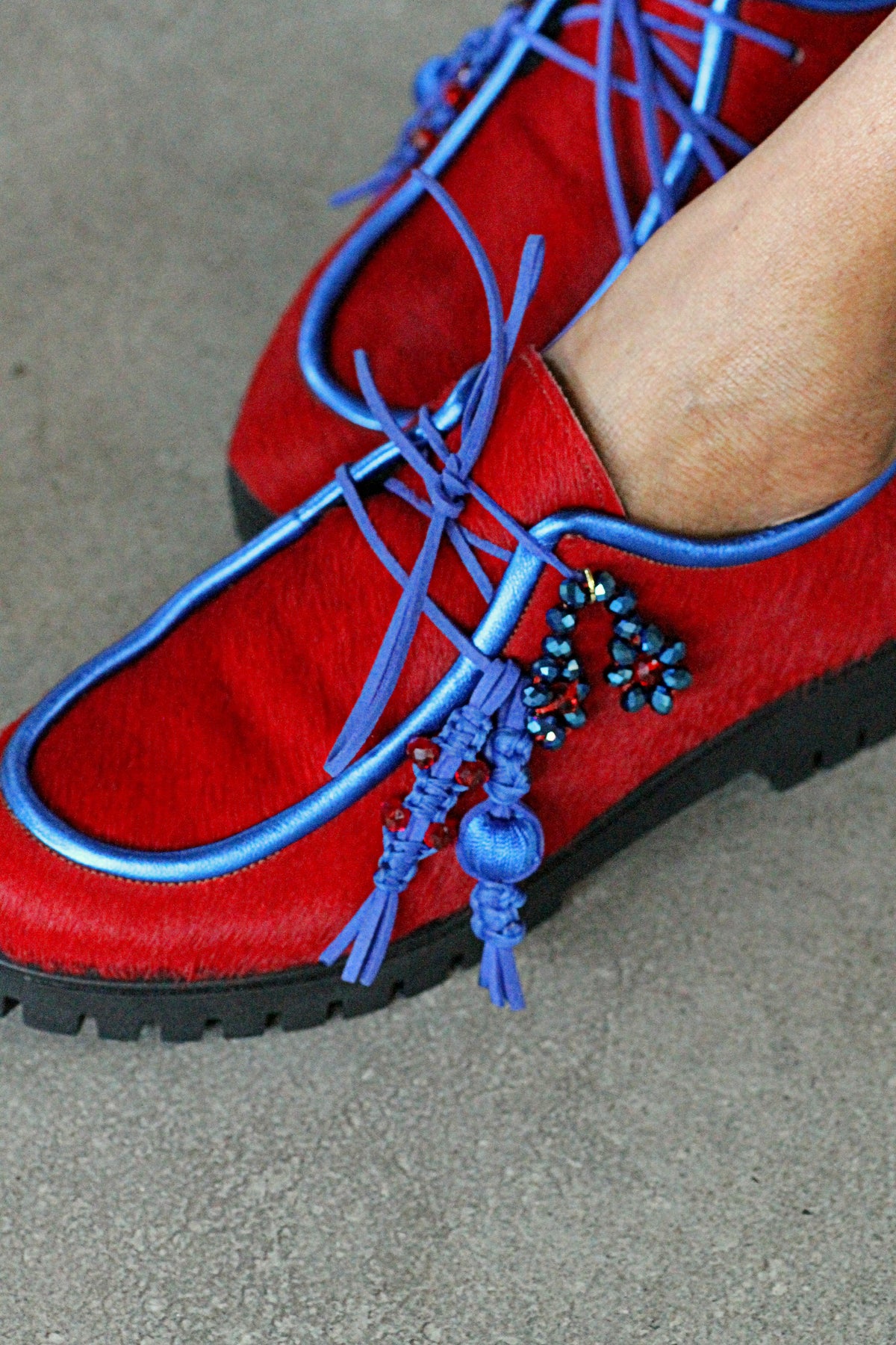 Palomina is made for the woman who isn’t afraid of standing out, not in a loud way, but in a confident, intentional, I-know-what-I-like way. She loves pieces that feel unique, that bring joy, that turn getting dressed into a small celebration of her own style. Crafted from deep wine red cowhide leather and contrasted with electric blue details, Palomina is striking without trying too hard. The leather cords are hand embellished with removable macramés and crystals by our team, adding a touch of handcrafted charm to the bold palette. Inside, they’re lined with black faux fur for soft warmth, while the durable sole keeps every step comfortable.